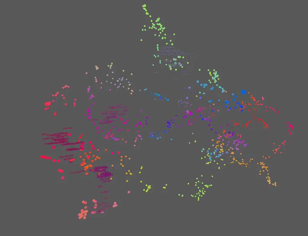 As expected, the text embeddings naturally cluster the Wikipedia articles into similar groups, mimicking their manual categorizations. In these visualizations, I display the title of the Wikipedia page and position it based on the “meaning” of the text on that page.